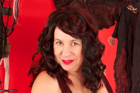 Manuela, horny mature milf slut wearing red sexy play suite and high heel shoes. Showing spread legs and fingering herself.