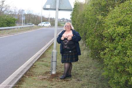 I was out and about flashing my big curvy ass, when I saw these steps up to the highway.I could help go to the top and flash to the traffic