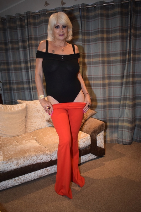 Watch me strip out of red flare trousers and under crutch top to show off my naked body.